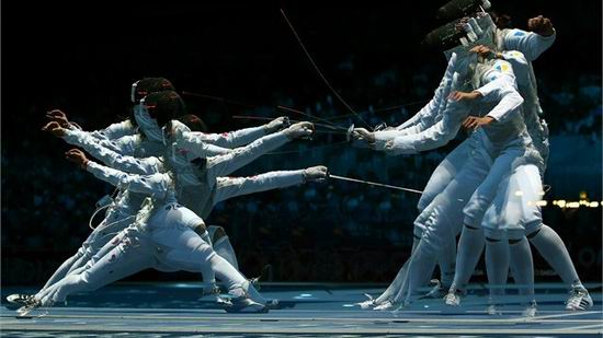 多重曝光相結(jié)合的攝像頭下的韓國與烏克蘭進(jìn)行的女子花劍比賽