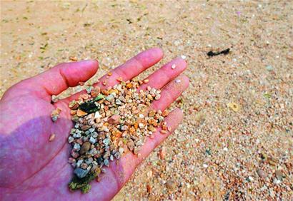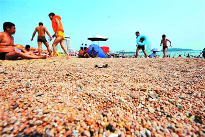 昨天,記者來到了第一海水浴場??拷R路一側的沙灘遠看是黃白色的沙子,走近一看卻是如綠豆大小的石子,還摻雜了一些海蠣子皮,腳踩在上面有一種麻酥酥的感覺。繼續(xù)往大海的方向走去,取而代之的是沙子和石子混合在一起的“沙灘”,走起來硌腳的感覺會輕一些。在較為濕潤的靠近海的地方,地上的沙灘都是一些白色、半透明的石子細沙。調查發(fā)現,一浴東西兩側的沙質有所不同,浴場的東側沙灘沙質比較細膩,西側沙灘則較粗。