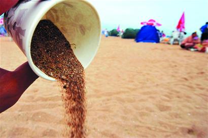 由于在每個海水浴場里,離海邊的距離不同,沙質(zhì)也不相同。在實地調(diào)查時,記者選取了每個沙灘中,所占面積最多的沙質(zhì)來進(jìn)行比較。同時,根據(jù)沙灘距海水的不同距離,分別在海水邊、沙灘中部和沙灘岸邊的位置取樣,比較準(zhǔn)確地反映了各個沙灘的實際情況。 權(quán)威說法 游客太多致細(xì)沙流失