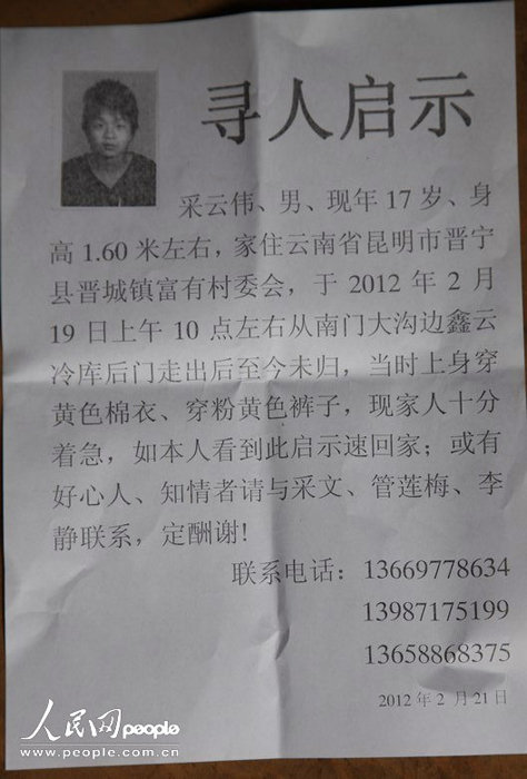 資料圖:家屬們自己制作了這張尋人啟事,四處張貼。