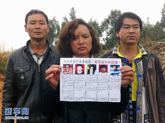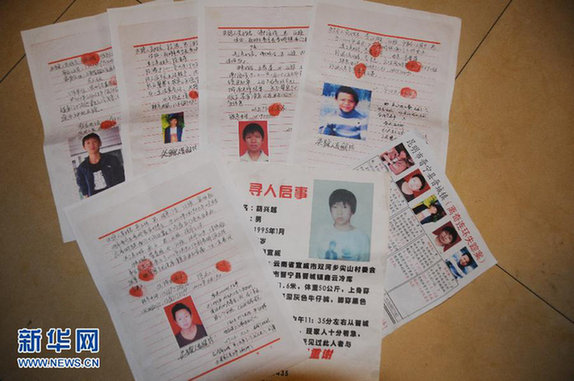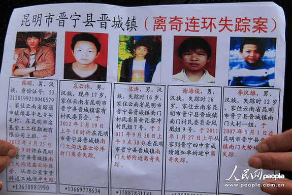 ????記者從公安機(jī)關(guān)獲悉,為盡快查清云南晉寧多人失蹤案的案情和責(zé)任,繼5月初派出刑事專家工作組后,公安部又于5月21日派出由公安部領(lǐng)導(dǎo)帶隊(duì)的案件督察組,赴當(dāng)?shù)亻_展督辦工作,要求進(jìn)一步加大案件偵辦力度,堅(jiān)決查清案情,嚴(yán)肅追究相關(guān)人員的責(zé)任,給受害者家屬一個(gè)負(fù)責(zé)任的交待。圖為多名家長自發(fā)印制了尋找失蹤孩子的信息(5月8日攝)。
