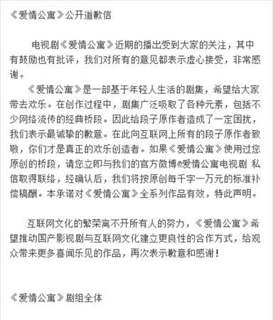 針對網(wǎng)友質(zhì)疑的《愛情公寓》抄襲美劇各種情節(jié)橋段和大量網(wǎng)絡(luò)段子,《愛情公寓》出品方發(fā)布公開信稱,若使用過網(wǎng)友原創(chuàng)橋段,可與劇組聯(lián)系,按原創(chuàng)千字一萬元標準補償稿酬,并向作者致歉。