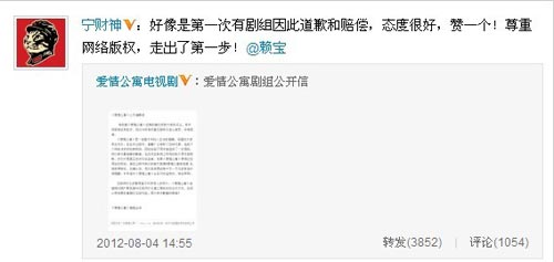 對于《愛情公寓》出品方的做法,知名編劇寧財神給予了肯定:“好像是第一次有劇組因此道歉和賠償,態(tài)度很好,贊一個!尊重網(wǎng)絡(luò)版權(quán),走出了第一步!”他也正是從網(wǎng)絡(luò)寫手起家。而當事人賴寶也轉(zhuǎn)發(fā)了致歉信并表示很欣賞劇組的作法,不會要求賠償。
