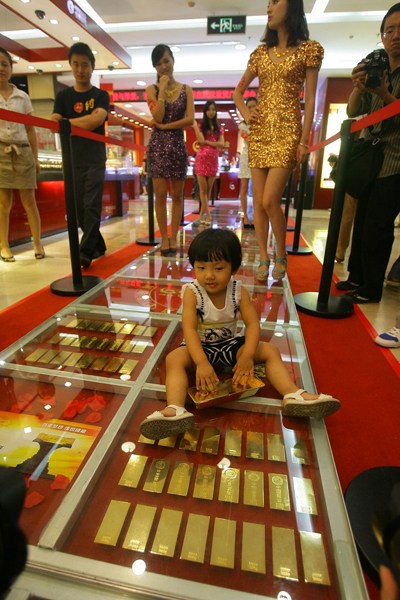 8月5日,武漢一商家用了200公斤純黃金金磚“鋪”成“金光大道”,引來眾多市民“踩金”。