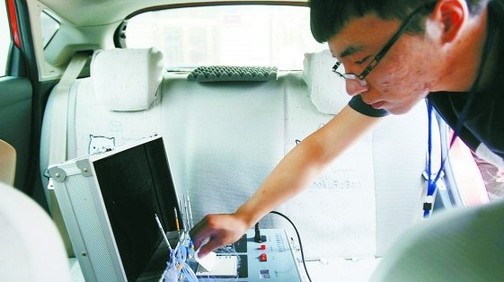 檢測(cè)人員使用專業(yè)儀器測(cè)車內(nèi)有害氣體。