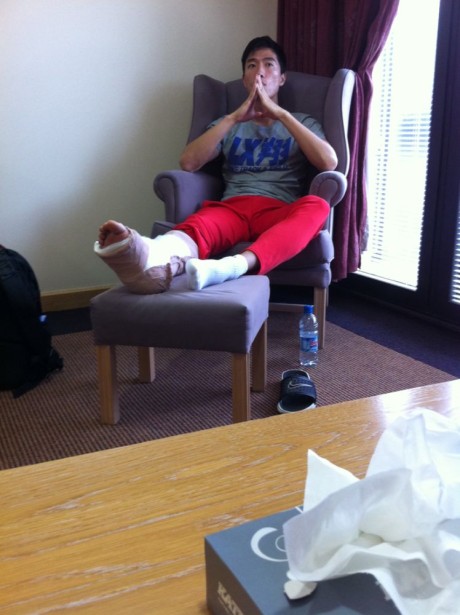 ????當(dāng)?shù)貢r(shí)間8月9日下午劉翔將在倫敦接受右腳跟腱手術(shù),而住在騰訊倫敦大本營的翔爸翔媽也趕赴醫(yī)院探望兒子,騰訊記者王正根通過微博記錄了飛人與父母相見的場景,他在微博中寫到:來到醫(yī)院,見到父母,翔眼眶也濕潤了!圖中可見劉翔雙手并攏在臉前,受傷的右腳跟腱則被厚厚的繃帶所包裹。