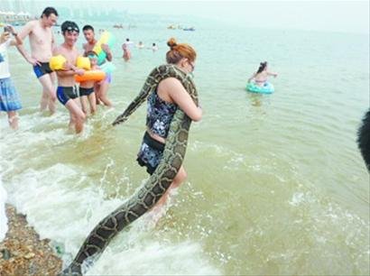女子扛4米長(zhǎng)蟒蛇海邊戲水 稱已喂養(yǎng)11年(圖)
