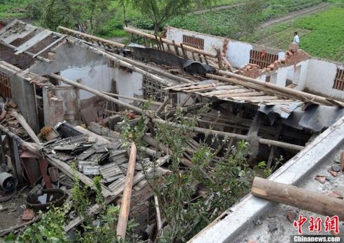 ????8月9日17時15分左右,一場龍卷風(fēng)襲擊了江蘇姜堰市蔣垛鎮(zhèn)的界河、興港、蔣垛等8個村,造成了三百多間房屋損毀,四百多頭牲畜死亡,一百多戶農(nóng)戶受災(zāi),所幸未造成重大人員傷亡。圖為8月10日