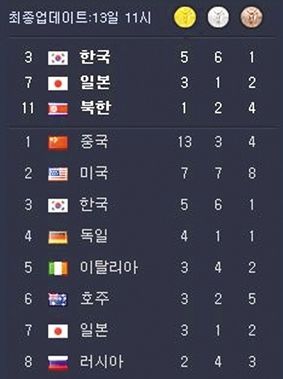 ????韓國(guó)一媒體為凸顯本國(guó)的賽場(chǎng)成績(jī),在榜單上畫(huà)了條細(xì)線。乍一看,韓國(guó)正領(lǐng)先于日本、朝鮮,排在“榜首”呢。
