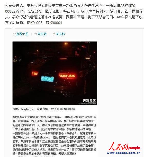 實名認(rèn)證網(wǎng)友@興賢堂轉(zhuǎn)天涯爆料帖稱,19日晚9點左右,安徽合肥驚現(xiàn)“最牛官車”,一輛奧迪A8掛著皖O 00852的車牌,在“安徽第一路”長江路上鳴警笛,“棒棒棒的喇叭聲音特別大,驅(qū)趕著過路車輛和行人”。車開到安徽省委附近,有兩輛牌照分別為皖K90001與皖K9J098的轎車在此等候。在奧迪A8的開道下,三輛車開至欽都會夜總會。到夜總會門口后,A8車牌被摘下放在了后備箱。網(wǎng)帖還提到,“懂行的網(wǎng)友一看就知道這牌照是什么單位的,有圖有真相,請問是誰賦予了這些人權(quán)力?”