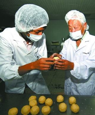 9月6日上午,記者見到了已經(jīng)82歲高齡的高培義老先生。盡管已年過八旬,老人精神矍鑠、身體硬朗。提起老月餅,老人如數(shù)家珍,甚至連他哪一天開始拜師學(xué)做蛋糕,都記得清清楚楚。14歲的高陪義為了糊口從現(xiàn)在的膠南(時(shí)稱膠縣)來到青島,在一家俄國人開辦的西式糕點(diǎn)廠當(dāng)學(xué)徒。在當(dāng)時(shí),蛋糕師是個(gè)技術(shù)活,首先是吃得好,每頓飯都有蛋糕吃,還經(jīng)常有肉,所以是令很多人羨慕的行業(yè)。由于老人當(dāng)學(xué)徒的“瑪爾斯”制作的西式糕點(diǎn)質(zhì)優(yōu)價(jià)廉,美國兵經(jīng)常在店門口前排起長隊(duì)。為了防止紙幣貶值,“瑪爾斯”掌柜將賺來的美元換成一兩一個(gè)的金元寶。“一個(gè)星期賺500多個(gè)?!庇捎诮?jīng)濟(jì)效益好,“瑪爾斯”成為當(dāng)時(shí)青島地區(qū)工資待遇最好的單位。早在上個(gè)世紀(jì)四十年代,青島糕點(diǎn)界就開始注意品牌經(jīng)營,當(dāng)時(shí)賣的月餅都用草紙包裹、草繩扎系,上面貼一張紅紙,寫著生產(chǎn)單位的名字、地址。