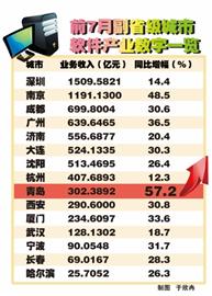 在這15個計劃單列市和副省級城市中,前7個月,按照軟件業(yè)務收入總量進行排名,分別是深圳、南京、成都、廣州、濟南、大連、沈陽、杭州、青島、西安、廈門、武漢、寧波、長春、哈爾濱,其中,排名第一的深圳實現(xiàn)軟件業(yè)務1509.58億元,同比增長14.4%;排名第二的南京實現(xiàn)軟件業(yè)務收入 1191億元,同比增長48.5%;排名第三的成都實現(xiàn)軟件業(yè)務收入699.8億元,同比增長30.6%。我市盡管在所有計劃單列市和副省級城市中軟件業(yè)務收入僅排名第九,但增長速度卻排名第一,高于排名第二的南京近10個百分點。