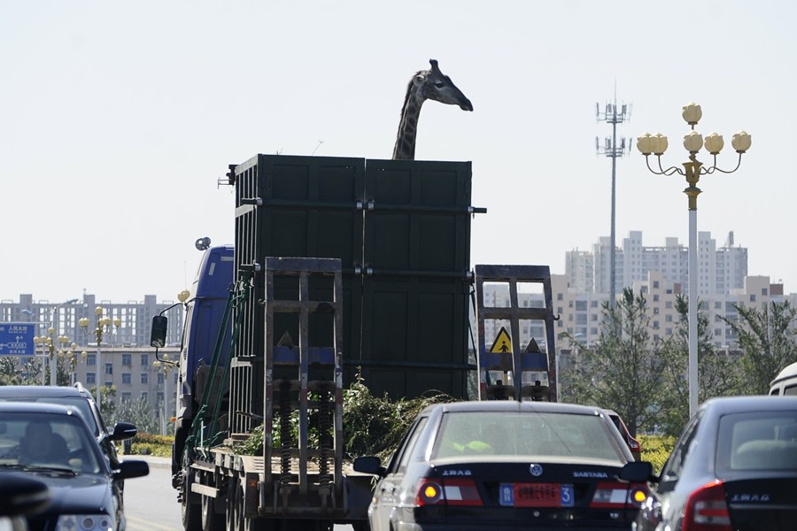 臨沂長頸鹿搬新家 公路遇路牌自己低頭