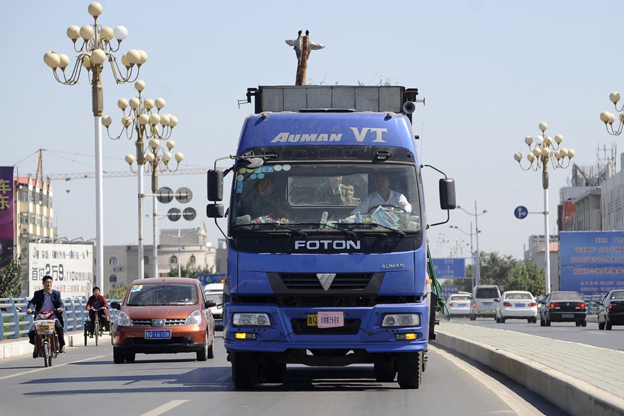 臨沂長頸鹿搬新家 公路遇路牌自己低頭