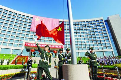 上午9時(shí),國旗護(hù)衛(wèi)班的武警戰(zhàn)士邁著鏗鏘有力的步伐,護(hù)衛(wèi)著鮮艷的五星紅旗來到旗桿下。在雄壯的中華人民共和國國歌中,五星紅旗冉冉升起,與辦公樓上懸掛的巨幅國旗交相輝映。軍禮、少先隊(duì)禮、注