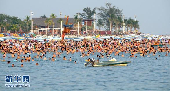 10月1日,人們?cè)趶V西北海銀灘海水浴場(chǎng)游玩。 新華社發(fā)(李君光攝)