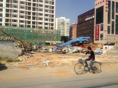 昨日,一名路人騎車經(jīng)過被毀的工地。昨日凌晨,地鐵10號線二期成壽寺站至宋家莊站區(qū)間一工地被強行毀壞,井架等施工設(shè)備被砸壞,多棟塑鋼房被徹底推平,施工公司稱損失上百萬。新京報記者陳博攝