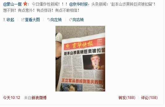 19日上午,網(wǎng)友“蒙山一倔”在微博爆料稱“趙本山涉黑轉(zhuǎn)巨資被扣留”,還附上報(bào)紙新聞的照片,引起網(wǎng)友廣泛轉(zhuǎn)發(fā)。但很快有網(wǎng)友指出圖片中的報(bào)紙是“京華快報(bào)”,經(jīng)查證是并不存在的假報(bào)紙,并非“京華時(shí)報(bào)”。