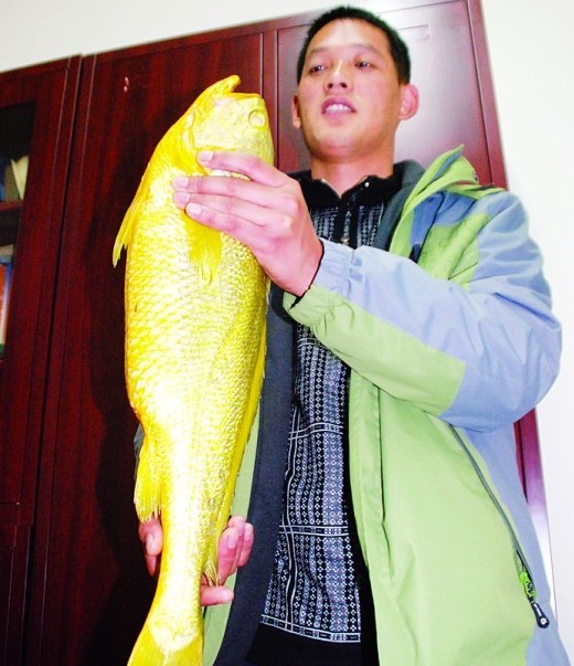 ????11月11日,膠南某水產(chǎn)公司一位漁民在膠南的外海撈出一條金色的大魚(yú),這條魚(yú)長(zhǎng)62厘米,重4斤6兩,全身金黃。漁民剛開(kāi)始以為是大黃花魚(yú),不過(guò),經(jīng)過(guò)黃海水產(chǎn)研究所的魚(yú)類(lèi)史專(zhuān)家鑒定,初步認(rèn)為是黃唇魚(yú)的可能性比較大,這種魚(yú)的經(jīng)濟(jì)價(jià)值很高。