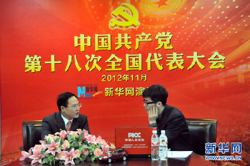 2012年11月13日,十八大代表、廣東省梅州市委書記朱澤君作客新華網(wǎng)設在京西賓館的十八大訪談間,接受新華網(wǎng)專訪。新華網(wǎng) 李非 攝