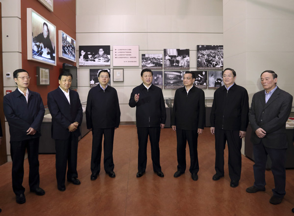 11月29日,中共中央總書記、中央軍委主席習(xí)近平和中央政治局常委李克強(qiáng)、張德江、俞正聲、劉云山、王岐山、張高麗等來到國家博物館,參觀《復(fù)興之路》展覽。(新華社記者 蘭紅光 攝)
