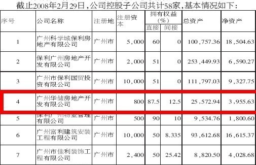 ?廣州華儲房地產(chǎn)開發(fā)有限公司,主營業(yè)務(wù)為房地產(chǎn)經(jīng)營,是截止到2008年2月29日,保利房地產(chǎn)(集團)股份有限公司控股的58家子公司之一,保利房地產(chǎn)(集團)股份有限公司直接擁有該公司87.5%的權(quán)益。享有絕對控制權(quán)……(點擊查看全文>>)