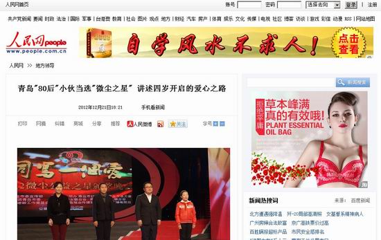 青島新聞網(wǎng)青青島社區(qū)版主“故事”的事跡,被人民網(wǎng)轉(zhuǎn)載報(bào)道。正如“最美乘務(wù)員朱麗”、“最美公交司機(jī)”、“浮山環(huán)保哥”等優(yōu)秀人物一樣,青島眾多愛心市民、愛心網(wǎng)友的事跡,不斷成為全國典型,通過中央級媒體不斷在全國范圍內(nèi)廣為傳播,為青島這座愛心之城添加了一抹又一抹亮麗的色彩。(點(diǎn)此查看人民網(wǎng)報(bào)道)