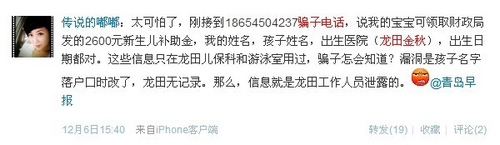 ????無獨有偶,12月16日,記者接到網(wǎng)友“綠小魚”投訴,稱有人打電話讓去領(lǐng)補(bǔ)貼,并稱:“今天是最后一天,逾期不予辦理?!薄熬G小魚”覺得好笑:“16日是星期日,市南財政局根本不上班?!辈贿^她同樣不解,騙子在電話里準(zhǔn)確說出了寶寶姓名、家庭住址等信息,他們是如何知道這些的?