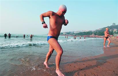 兩三分鐘后,首批下水的冬泳者開始上岸,10多分鐘后,大家陸續(xù)返回岸上,繼續(xù)鍛煉身體?!耙话愣菊呦滤褪?分鐘,能堅(jiān)持到10分鐘的就是高手了?!笔卸緟f(xié)會(huì)楊主席介紹。20多分鐘后,記者發(fā)現(xiàn)海里還有1個(gè)人沒(méi)有上來(lái),詢問(wèn)得知,那個(gè)人是聾人冬泳隊(duì)的樊景魁,今年已經(jīng)55歲?!袄戏苡伟雮€(gè)小時(shí),厲害啊。”沙灘上許多冬泳愛(ài)好者對(duì)老樊佩服有加。 (記者 趙健鵬)