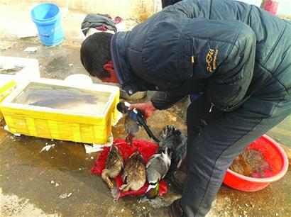 昨天上午,記者來到移風店鎮(zhèn)一處河畔,在通往平度的一座大橋前,有一個賣活魚的攤位,在活魚攤位旁邊,還擺著5只死禽,其中一只為喜鵲,兩只為褐色羽毛的母野鴨子,兩只為頭長藍綠色羽毛的公野鴨子,其中一只公野鴨只有喜鵲那么大小,應該是一只還未成熟的小鴨子。記者注意到,一只野鴨子的嘴巴還未合上,半睜著眼睛,死亡時應該比較痛苦。