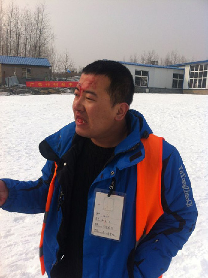 記者當(dāng)時(shí)距事發(fā)現(xiàn)場(chǎng)約200米左右,當(dāng)記者走進(jìn)時(shí)看見,茶山滑雪場(chǎng)工作人員正掄著滑雪板砸向游客。被打游客一共三人,其中兩男一女,一位身穿橘紅色上衣的男子頭部有長(zhǎng)達(dá)約5公分傷口,藍(lán)衣男子鼻出血牙齒松動(dòng),女的沒見什么傷,茶山滑雪場(chǎng)工作人員中也有一人頭部被打傷出血,現(xiàn)場(chǎng)一片混亂。