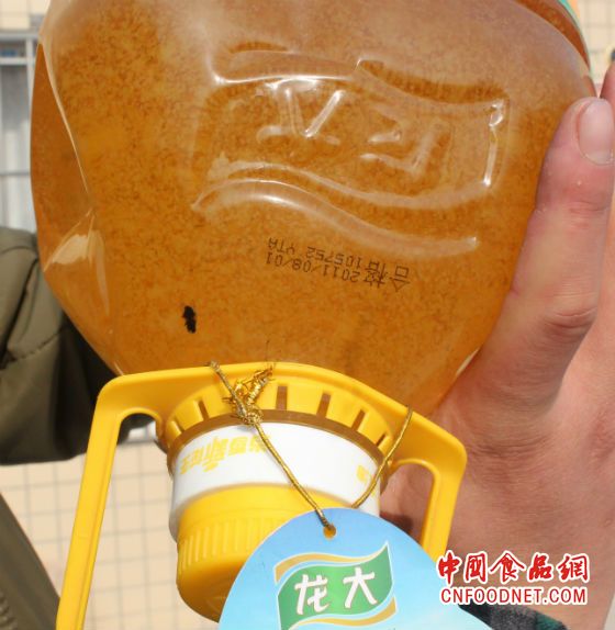 ????12月4日,記者見(jiàn)到了石先生提供的龍大花生問(wèn)題油。記者看到,該油桶上標(biāo)注:出廠日期是2011年8月11日,產(chǎn)地是山東龍大植物油有限公司,批次號(hào)是105752YTA,保質(zhì)期18個(gè)月,綠色產(chǎn)品和質(zhì)量安全產(chǎn)品,并經(jīng)過(guò)ISO9000國(guó)際質(zhì)量體系認(rèn)證等字樣。記者仔細(xì)觀察該桶油后發(fā)現(xiàn),油桶封口沒(méi)有打開過(guò)的痕跡,油桶內(nèi)的蒼蠅卻清晰可見(jiàn)。