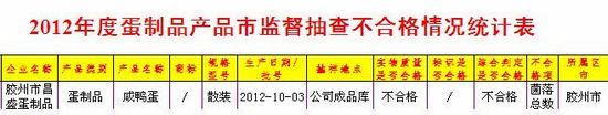 ??? 膠州市昌盛蛋制品廠的咸鴨蛋(不合格項:菌落總數(shù))
