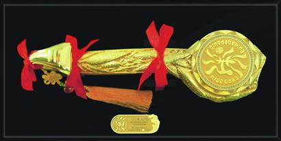 擺件以抽象鑰匙為形象,寓意開啟2014年青島世園會(huì)。產(chǎn)品以青島典型歐陸風(fēng)情的“萬(wàn)國(guó)建筑”和代表著青島的特色海岸線襯托會(huì)徽LOGO,寓意太陽(yáng)初升浮山灣海韻的曙光,其精髓意在“上善若水”的品德。精致的浮雕工藝,細(xì)膩的線條,再加上鑲嵌的72顆施華洛水鉆和24K純金電鍍,使產(chǎn)品顯得高檔、華麗。