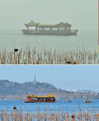 上圖:1月28日,杭州西湖游船在霧中行駛;下圖:1月1日拍攝的晴朗天氣下的杭州西湖。(新華社發(fā))