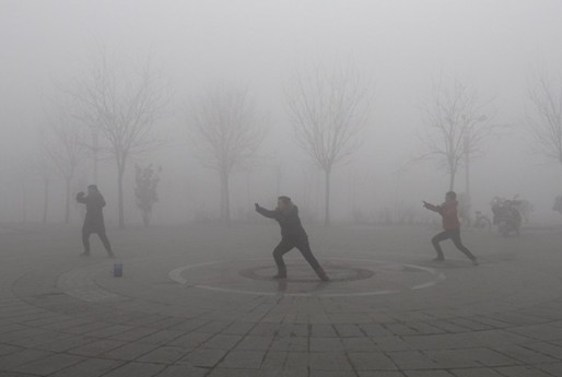 1月28日,在河南省焦作市溫縣子夏公園,市民在霧中打太極拳。(徐宏星)