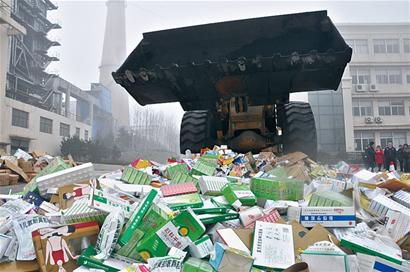????記者在銷毀現(xiàn)場看到,規(guī)格各異、品種繁多的藥品堆積得像座小山。隨著指揮人員一聲令下,轟隆隆的大型鏟土機(jī)緩緩地爬上“藥山”,一陣陣“噼噼啪啪”過后,原本包裝精美的藥品變得面目全非。經(jīng)過反復(fù)碾壓,這些藥品被送進(jìn)煤爐,徹底焚毀。