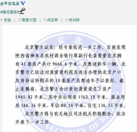 ????北京警方證實:經(jīng)專案組進(jìn)一步工作,目前發(fā)現(xiàn)陜西省神木縣農(nóng)村商業(yè)銀行原副行長龔愛愛在京擁有41套房產(chǎn)共計9666.6平米,及奧迪轎車一輛。北京警方已依法對龔愛愛利用其違法辦理的北京戶口及身份證所購買的10套房產(chǎn)及奧迪車予以查封。截止發(fā)稿前,北京警方合計查封龔愛愛名下房產(chǎn)1945.02平米,其中辦公用房1562.19平米、商業(yè)用房166.36平米、車位80.14平米、住宅136.33平米。北京警方將與有關(guān)地區(qū)司法機(jī)關(guān)積極配合,依法開展下一步工作。