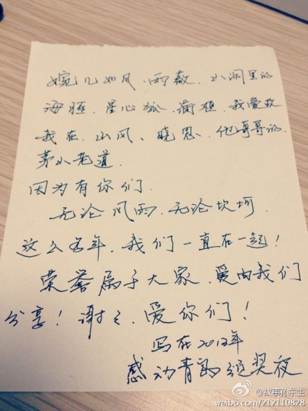 獲獎之夜,孫東生寫下給自己親密網(wǎng)友的話:“因為有你們,無論風雨,無論坎坷,這么多年,我們一直在一起!榮譽屬于大家,愛由我們分享!謝謝!愛你們!”他把這段文字分享給多年來活躍在公益活動前沿的弟兄姊妹們?!狜星心狐oO心似蓮花開 @天之藍也 @傳說中的薇姐 @嶗山風 @蒲桓_ @青島茅山老道 @青島一葫蘆_綻放 @婉兒如風 @yaa_yaaa @劉璐_Rachel