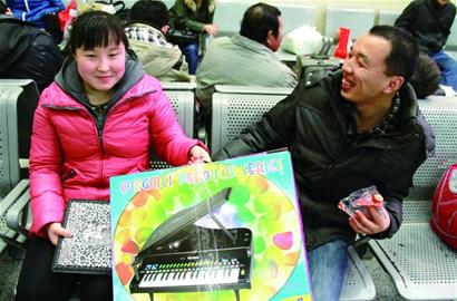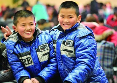 ????帶著一對(duì)孿生兒子,劉女士提前5個(gè)小時(shí)就來(lái)到火車站候車廳?!白疖囂珨D了,回家過年的禮物回去再買吧?!眲⑴扛嬖V記者,現(xiàn)在物品流通很方便,青島這邊超市里的商品和曹縣老家的東西差不多,價(jià)格也相差不大?!安贿^對(duì)家里老人來(lái)說,這對(duì)大孫子就是最好的禮物了。”劉女士笑著說,她和丈夫在青島做小生意,自己的一對(duì)孿生兒子——12歲的謝良奧兄弟二人在青島上5年級(jí)?!凹依锢先嗣看未螂娫掃^來(lái),都要問問這倆大孫子的情況,把他們哥倆帶著回家過年,比給老人帶什么禮物都強(qiáng)?!眲⑴啃χf。