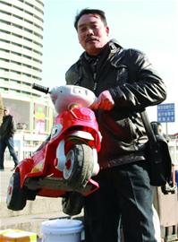 ????火車站廣場(chǎng)上的寒風(fēng)有些刺骨,可年過六旬的吳善松坐在廣場(chǎng)樓梯上不時(shí)露出甜蜜的笑容?!斑@輛大摩托車是給孫子買的,孫子一直說想要輛電動(dòng)摩托,有點(diǎn)貴,我狠狠心才買的。”吳善松摸著身邊的一輛塑料電動(dòng)摩托車告訴記者,他老家在安徽金寨,和同鄉(xiāng)“組團(tuán)”來(lái)青,在一個(gè)施工隊(duì)打工,一干就是兩年,這是來(lái)青后第一次返鄉(xiāng)過年。吳善松說,他離開老家時(shí),孫子只有兩歲,這兩年和家人打電話,聽到孫子在電話那頭叫“爺爺”,他激動(dòng)得眼淚直流?;丶疫^年前,他問孫子想要什么禮物,孫子說想要電動(dòng)摩托車。“只要孫子喜歡,花多少錢我都愿意?!眳巧扑烧f。