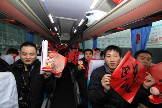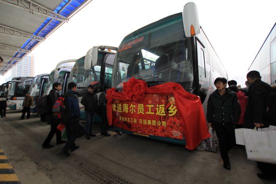 ?????青島新聞網(wǎng)2月6日訊 今天早上7:40,交運集團青島汽車東站候車大廳內(nèi)張燈結(jié)彩,人們臉上洋溢著即將回家團聚的喜悅。承載著1051海爾員工的13個長途車班次陸續(xù)開出了青島汽車東站,平安運送農(nóng)民工兄弟踏上了返鄉(xiāng)旅途,這是青島市總工會、交運集團春節(jié)前歡送農(nóng)民工平安返鄉(xiāng)的平常一日。市總工會、交運集團有關(guān)領(lǐng)導(dǎo)上車為返鄉(xiāng)員工發(fā)放了福字、吉祥物等, 祝福辛勞一年的職工們平安回家過年。細心的汽車東站員工還為返鄉(xiāng)務(wù)工人員準備了免費姜湯御寒。