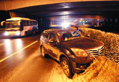 市區(qū)道路上車流量較大,降雪經(jīng)車輛碾軋,大都融為雪水,雖然地面變得濕滑,但總不至于無法行車。郊區(qū)市的道路就不同了,由于車流沒有那么密集,地面降雪在融化后很快結(jié)冰,傍晚時分,隨著氣溫下降,一些道路上的雪水凝結(jié)成冰。昨天傍晚5時30分左右,一輛由機場發(fā)往市區(qū)的大巴車因為地面濕滑,在由機場通往環(huán)灣路的高架路上拋錨。 “車沒有壞,主要原因是地面結(jié)冰了,車輪抓不住地面,即便是能抓住地面,也不牢靠,在行駛中車?yán)鲜撬ξ?。而且前面一起接一起的撞車事故,為了安全起見,大巴司機建議我們下車,我們改為步行前進(jìn)。 ”市民徐先生說,他剛從外地歸來,從南寧順利回來了,但從機場回市區(qū)卻變得非常艱辛。