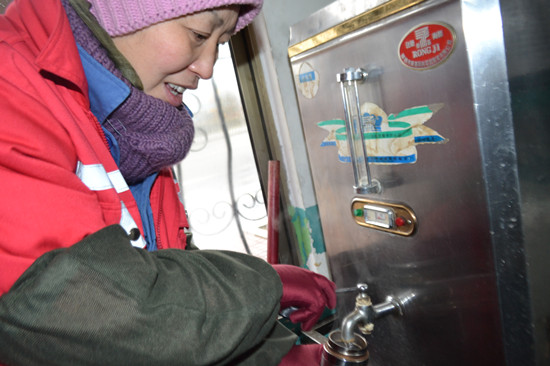 ????環(huán)衛(wèi)工人李姐在溫馨巴士31路隊調(diào)度室里接熱水