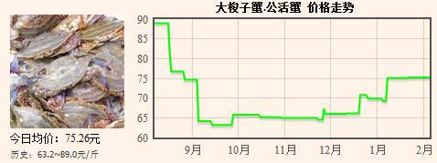圖中曲線表示在各時(shí)間段內(nèi)海鮮商鋪大梭子蟹的平均價(jià)格,從圖中我們可以了解到自去年9月份以來一路上漲,一直持續(xù)到今年2月份。