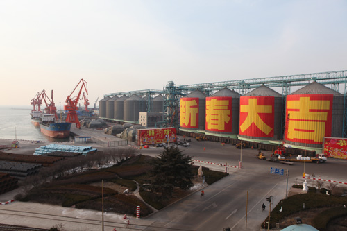 ??? 在青島港,飽含著吉祥和祝福的“新春大吉”四個(gè)大字在青島港老港區(qū)糧罐上高高掛起。這代表著青島港向一年來(lái)支持港口發(fā)展的船東、貨主、各界賓朋及廣大員工送上新年最真摯的祝福。據(jù)了解,每個(gè)大字為575平方米,四字總計(jì)2300平方米,為全國(guó)最大祝福語(yǔ)。