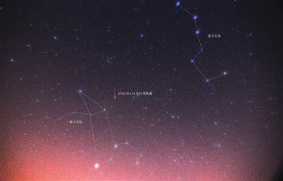 根據(jù)預(yù)報(bào),清晨4時(shí)是小行星最亮的時(shí)候,此時(shí)它應(yīng)該位于獅子星座的尾巴處,記者調(diào)試設(shè)備后開(kāi)始進(jìn)行一個(gè)小時(shí)的持續(xù)拍攝。因?yàn)樾⌒行堑牧炼缺阮A(yù)報(bào)的要暗很多,所以在望遠(yuǎn)鏡中始終沒(méi)有發(fā)現(xiàn)它的身影,一切只能憑借對(duì)軌道的預(yù)測(cè)和相機(jī)的表現(xiàn)了。一個(gè)小時(shí)后,天空已經(jīng)微微發(fā)亮,持續(xù)拍攝結(jié)束。查看拍攝參數(shù),一個(gè)小時(shí)內(nèi)共拍攝了376張圖片,最終在這些圖片中發(fā)現(xiàn)有27張有異樣——一條非常暗弱的“橫線”在數(shù)百顆星星中穿行,對(duì)比軌道,這就是掠過(guò)地球的2012DA14小行星。