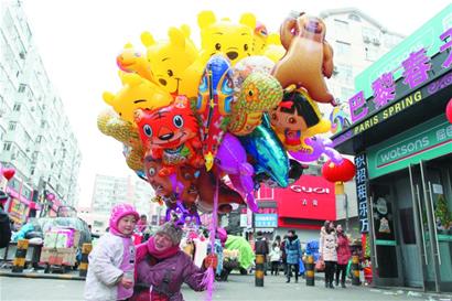 ????春節(jié)過后,孩子們喜歡的“喜羊羊”“小熊維尼”“海綿寶寶”等卡通圖案的氫氣球在街頭隨處可見。昨天上午,記者來到臺東步行街,看到幾個商販?zhǔn)掷锬弥鞣N圖案的氫氣球大聲地吆喝著,市民陳女士帶著3歲大的孫女彤彤來到商販跟前,彤彤看到花花綠綠的氣球非常喜歡,非要買一只 “喜羊羊”圖案的氫氣球,陳女士立刻掏出5元錢,給彤彤買了一個。