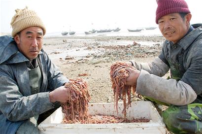 ????“捕撈海蚰蜒,一種是拖網(wǎng),另一種是釘網(wǎng)?!崩侠钫f,他們將船開出4里開外后,根據(jù)海水的流向,將一張10多米的大釘網(wǎng)撒進(jìn)了海里,不一會,10多斤的海蚰蜒就進(jìn)了網(wǎng)。隨后又下了幾網(wǎng),收獲約有百余斤海蚰蜒。老李和雇工又撒下了另一張網(wǎng),開始捕獲小魚蝦。經(jīng)過4個多小時的捕撈,老李的船艙已經(jīng)裝得差不多了,尤其是海蚰蜒,足足兩大籮筐。老李說,由于海上氣溫很低,他們出海捕撈不到10分鐘工夫,手就凍僵了。