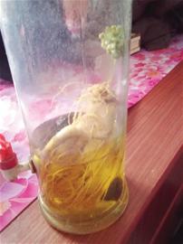 記者看到,開花的人參躺在一個(gè)玻璃瓶中,個(gè)頭跟在商場里購買的普通胡蘿卜一般大小,參須及參根尚浸泡在酒中,上半部分則裸露在外,經(jīng)過長時(shí)間的浸泡,人參泛著灰黃色,一根成人小指長的綠莖從參頭部長出,上面頂著一撮綠豆大小的穗,這就是人參花。